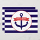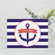 An ocean themed baby shower invitation featuring a navy blue and white striped background on front and back. Front features an illustration of a blue anchor covered with a red banner that says, "It's A Boy!"
