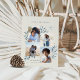 An elegant coastal holiday card design for beach or shore dwellers featuring 4 photos in a collage layout, adorned with blue watercolor coral, starfish, and botanicals. "Seas & Greetings" or your choice of holiday greeting appears at the top, with your family signature and the year at the lower left.