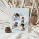 An elegant coastal holiday card design for beach or shore dwellers featuring 4 photos in a collage layout, adorned with blue watercolor coral, starfish, and botanicals. "Seas & Greetings" or your choice of holiday greeting appears at the top, with your family signature and the year at the lower left.
