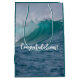 Paper gift bag with ocean wave design. Add “Congratulations” or “Happy Birthday” or any text to the front. Colour is ocean blue-green with white text and comes in three sizes. Long text will not fit on the wine / bottle size bag. Perfect for men or women and for most any occasion.