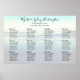 Poster for seating wedding guests at a seaside reception event. Background image is ocean waves and beach sand. This 23 x 36 inch seating chart has black text in both script, for up to 12 table numbers, and printed text for guests' names. Married names at top in elegant and modern, hand-written font with one or two lines for date and location of celebration. Each table number section has room for up to eight guests, or list fewer as needed. Tables are listed horizontally, but that is easy to change by changing the numbers using the templates. For fewer tables, simply delete sections as needed, keeping the look symmetrical. Upgrade the paper if you wish.