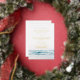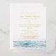 Memorial service invitation in white, blue, and gold foil with a small anchor atop a photo of blue ocean waves.