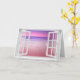 Open white window with purple and pink ocean sunrise scene for sympathy