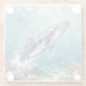 A oceanic themed coaster with a beautiful illustration of an impasto style whale swimming deep in the sea by vibrant colorful coral. A really beautiful coastal art. Colors used are teal, blue and soft coastal colors.