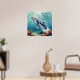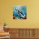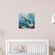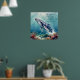A oceanic themed poster with a beautiful illustration of an impasto style whale swimming deep in the sea by vibrant colorful coral. A really beautiful coastal art. Colors used are teal, blue and soft coastal colors. A relaxing beachy poem for a calming day.