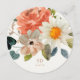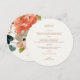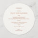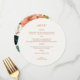 This circular menu card template features a set of contemporary fonts in ochre, against a chic ivory background. The back of the card includes a colourful floral display, alongside couple names and event date.