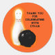 Halloween thank you stickers featuring funny Halloween ghost bowling pin and ball design for party favours and thank you notes. To personalise edit text to add name.