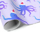 Wrapping Paper with a novelty Christmas pattern of smiling, purple, octopus illustrations wearing Santa hats on a light purple background.