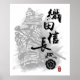 Calligraphy art of Oda Nobunaga (織田信長), below the kanji is the samurai signature of Nobunaga and the kamon of Oda clan, Oda mokkou. In the background is the statue of Oda Nobunaga at Kiyosu park, in front of the Castle that once served as his base of operations.