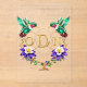 This exceptional clear acrylic invitation exemplifies what happens when artistic vision meets material innovation. Each hummingbird has been individually crafted with attention to anatomical detail, their iridescent plumage rendered in layers of emerald that suggest depth and dimension, now enhanced by printing on transparent acrylic that adds literal three-dimensionality. Ruby throat patches glow with jewel-like intensity against the crystal-clear background. Your monogram, presented in 24-karat gold-style typography, features letterforms with classical proportions and contemporary flair, all enclosed within an oval of diamond brilliance that shimmers magnificently on acrylic. Colorado columbines in majestic purple complete the composition with botanical authenticity, appearing to float in transparent space.
