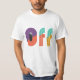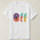 A vibrant t-shirt design featuring the text "OFF" in a bold, geometric font, with a vibrant colour scheme. The design is modern and eye-catching, with a strong graphic impact.