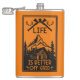 Well made flask, a little better than I had expected. Flask came in clear plastic box which gave it a nice presentation when I took it out of the zazzle packaging. Image is not printed on flask but on sticker. Don't know how this will hold up I haven't used it yet. This would make a Great gift! I plan to purchase more for friends! Cheers. I thought a little brighter than computer. Very crisp, writing wasn't