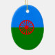 Official Romany gypsy traveller flag of green and blue representing the earth and sky with a red wagon wheel, representing travel.