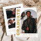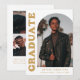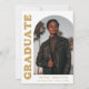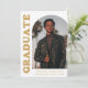 Stylish and trendy graduation announcement featuring the graduate's photo on the front with an offset arch photo frame. "Graduate" is displayed in bold gold retro lettering on a white background. Personalise the front of the arch photo graduation announcement by adding the graduate's name, school, and graduation year. The card reverses to display an additional 3 photos with space for custom text such as future college plans, career plans, graduation party details, etc. The gold graduation announcement is perfect for both high school and college graduates.