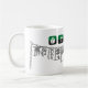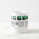 Oggun mug with achaba. Name of Oggun in text with cowrie design. Printed in three colours; green, black and grey.
