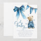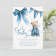 Set the scene for a joyful celebration with these blue jean baby themed baby shower invitations. Featuring an adorable bear in denim dungarees, a sweet denim bow, and playful blue stars scattered across a modern invitation template, they're perfect for honoring the parents to be.