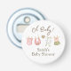 Celebrate the upcoming arrival of a sweet little girl with this charming watercolor baby shower button. The design features an adorable illustration of a clothesline strung with tiny baby girl outfits gently hanging to dry, creating a soft and whimsical look that’s perfect for a baby shower celebration.