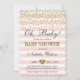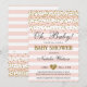 Pink and gold baby shower invitation with pink and white stripes and glitter accents. The pink background colour can be changed or removed. For matching items, visit my Zazzle shop: https://www.zazzle.com/violinevents. If you have any questions or custom requests, please don't hesitate to contact me.
