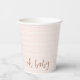 Pink and White herringbone pattern on a paper cup with a copper brown script that says "Oh baby." Simple, feminine, and hip design for a girl's baby shower. Coordinates with our Baby in Bloom Shower Collection.
