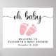 Cute welcome sign poster for your baby girl shower with "oh baby" in a pretty script with swashes and a pastel pink watercolor of baby feet. Personalise with your name and shower date.