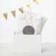 This design features a lovely script font and a rich grey background bordered in baby pink. It coordinates with a matching baby shower invitation. Get the matching baby shower invitation here: