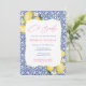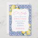 A Baby Girl is on the way! Celebrate with this pretty and fashionable invitations featuring vibrant watercolor lemons and glossy green leaves with pretty blossoms, complemented by cobalt blue and white tile surround and reverse side.