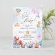 Fun and colourful baby shower invitation with watercolor sea animals, bubbles and light blue watercolor splash background.