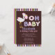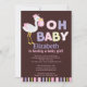 Start your girl baby shower off right with our cute & colourful Oh Baby stork baby shower invitation. Our modern baby girl invitation features a sweet flying stork with big bold bright lettering set on a brown background with purple, pink & green stripe border and back. ©Blackleaf Designs