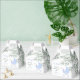 Adorable baby shower favour box to say thank you to guests for attending your baby shower! Perfect for those expecting a baby boy. Light green eucalyptus leaves surround the top all around, the front holds your personalised text and a blue baby stroller with tiny baby feet sticking out of the top. One side holds a colourful baby mobile and the back holds a cute teddy bear.