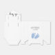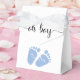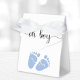 Cute party favour box for your baby boy shower featuring "oh boy" in a stylish script with swashes and a blue watercolor of baby feet. Underneath the flap you can easily personalise with the mother-to-be's name and shower date.