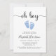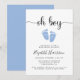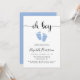Cute minimal baby boy shower invitation with "oh boy" in a stylish script with swashes and a pastel blue watercolor of baby feet. Underneath you can easily personalize the shower details.
