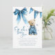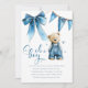 Set the scene for a joyful celebration with these blue jean baby themed baby shower invitations. Featuring an adorable bear in denim dungarees, a sweet denim bow, and playful blue stars scattered across a modern invitation template, they're perfect for honoring the parents to be.