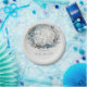Sweet bunny rabbit playing with a hacky sack "oh boy" blue floral wreath baby sprinkle design on a pale grey background.