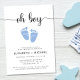Cute simple couple's baby boy shower invitation with "oh boy" in a stylish script with swashes and a pastel blue watercolor of baby feet. Underneath you can easily personalise the shower details.