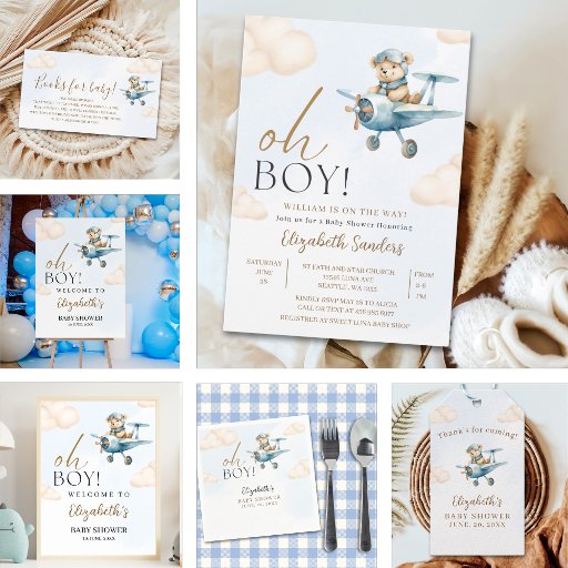 Celebrate your baby's upcoming arrival with ours with this cute bear design. Featuring a beautiful image of a cute bear piloting a small plane and the cheerful phrase "Oh Boy," it makes this design the perfect style to create a cheerful and whimsical tone for your event. For complementary products, please check out the collection of this cute design for a boy's baby shower.