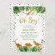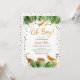This adorable baby shower invitation features tropical watercolor leaves with gold foil leaf embellishments and gold dinosaur silhouettes.