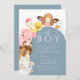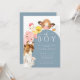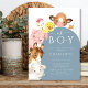 Modern Oh Boy barnyard animals design featuring the sweetest cow, horse, pig, chicken, baby chick & sheep surrounding a blue arch for a baby boy. Visit our shop to view our entire Oh Baby barnyard friends collection