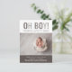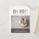 Affordable custom printed baby boy birth announcement postcards personalised with your photos and text. This modern minimalist design features bold typography in shades of neutral grey and taupe with Oh Boy! lettering and your baby's name, birth stats and photo below. Reverse side has a preppy stripe pattern or use the space for additional photos and text. Use the design tools to edit the colours and fonts or add more photos to create your own unique boy birth announcement cards.
