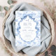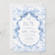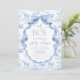 This Invitation is a charming fusion of classic elegance and playful whimsy. Featuring a delicate toile de Jouy motif in a soft baby blue hue, it beautifully showcases vintage-style safari animals—such as gentle elephants and graceful giraffes—nestled among intricate floral and botanical elements. The fine linework and soothing colour palette lend it an heirloom-quality aesthetic, perfect for a timeless and heartfelt celebration. Framed with a graceful blue ribbon and bow, and paired with refined typography, this invitation feels both sophisticated and sweet. It captures the wonder of a new adventure while honouring traditional beauty, making it a lovely way to welcome a baby with warmth and style. Matching items available.