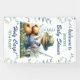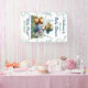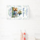 Blue and green fishing themed baby shower personalised banner. Cute watercolor illustration of a little boy fishing with his teddy bear surrounded by pretty foliage.