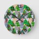 This wall clock has a design of Christmas trees in various shades of green, pink, silver, and gold with different decorations.