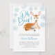 Cute and sweet winter wonderland theme baby shower invitation card featuring illustration of a deer laying down with blue snowflakes. The text says "Oh Deer! A sweet little baby is almost here." Perfect for a boy's shower in the winter.
