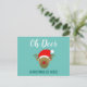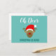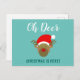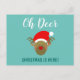 Simple, cute, cartoon Santa's reindeer blue holiday postcard with funny quote: Oh Deer Christmas is here!