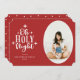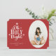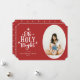 Whimsical typography, traditional holiday quote "Oh Holy Night", Christmas photo card. Card features festive red colour backgrounds, white text, oval photo frame for single photo on front, template text lines for name, year, message and family names.