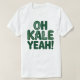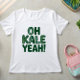 This image features a white t-shirt with the text "OH KALE YEAH!" printed in bold, green lettering. The letters are stylised with leafy textures, resembling kale. The "O" at the top is larger and has a more intricate leafy pattern.