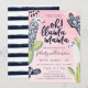 Cute and trendy cactus & llama baby girl oh llama mama baby shower fiesta invitation. The design features a beautiful and whimsical mother and baby girl llama illustration with the text "oh llama mama" displayed in a fun handwriting, script style typography. Stylised bold cactus illustrations and green watercolor cactus illustrations are incorporated around the sides of the invitation to draw your attention and to beautifully frame the invitation details. Bursting abstract designs create a fun and festive look. The llama baby girl shower invitation is designed in a colour palette of light blush pink, teals, green shades and deep navy blue to create a stylish, trendy and modern design. The reverse side features a modern, stylish and trendy navy blue watercolor stripe pattern that beautifully complements the front artwork. All illustrations contained in this modern, stylish and trendy cactus & oh llama mama baby girl baby shower invitation are hand-drawn original artwork by Moodthology. You can customise the text size, text colour, font and layout for your own personal design preference.