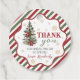 A festive holiday-themed favor tag featuring red, green, and white candy cane stripes, elegant Christmas greenery with red bows, and gold snowflake accents. This charming winter design is perfect for attaching to gifts, treats, or party favors at a first birthday celebration. Ideal for Christmas or winter-themed parties and customizable with a short thank-you message.