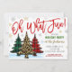 Trendy and unique design features awesome leopard and buffalo plaid check Christmas trees with a blue watercolor and faux wood background. Use this holiday Christmas party invitation for your festive holiday event of any kind - text is editable!