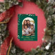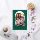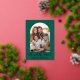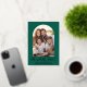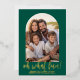 Add a vertical photo and family name to this Christmas photo card. The photo is in a trendy arch.