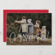 Cute holiday photo cards featuring your horizontal photo with "Oh What Fun!" displayed in a white handwritten script. Personalise the photo Christmas card with your family name and the year. The single photo holiday card reverses to display a red background with subtle white dots.